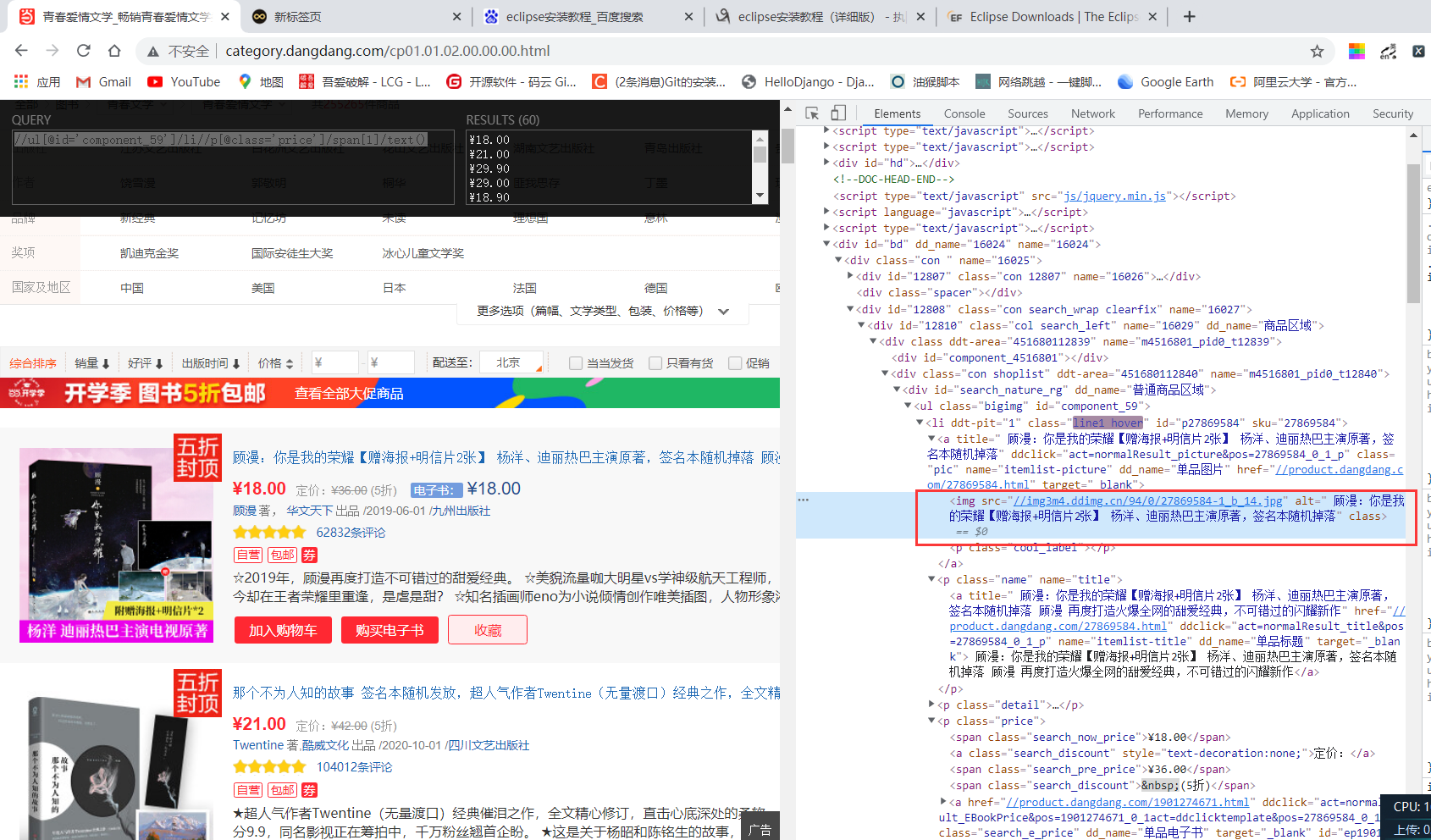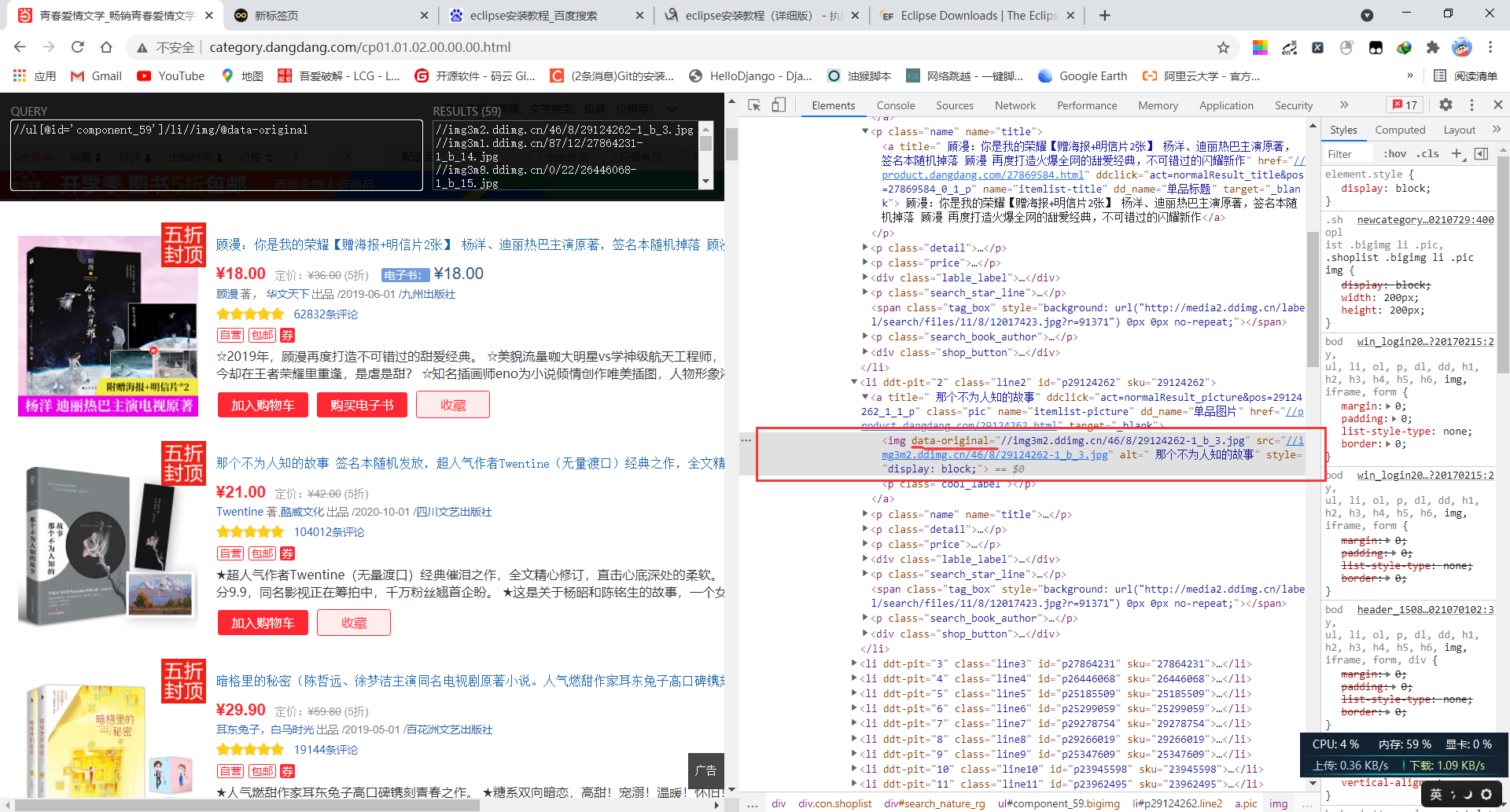 通过观察标签我们发现data-original属性,为此可以断定是图片是懒加载的方式,为此我们提取该属性的值回获取图片的url地址,图片url提取xpath表达式为//ul[@id='component_59']/li//img/@data-origina(上面第一张图),但是通过观察可以发现每一页的第一本书的图的表情没有data-origina属性,为此对于每一页的的第一条数据进行特殊处理提取其src属性,xpath表达式//ul[@id='component_59']/li//img/@src(上面第二张图) -