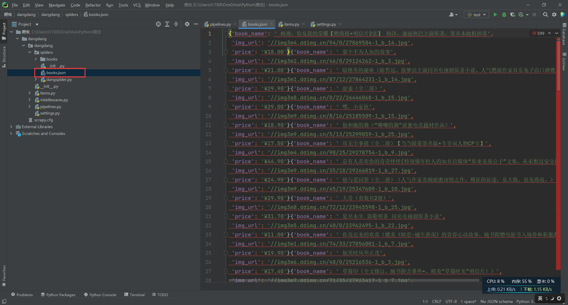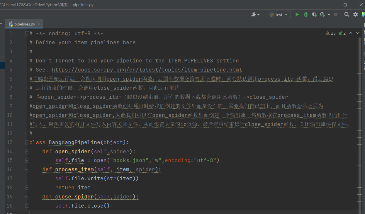 为管道编写相关函数,我们将爬取的数据保存为json文件,一个对象为json文件一项纪录,process_item函数中的item就是yield送过来的对象