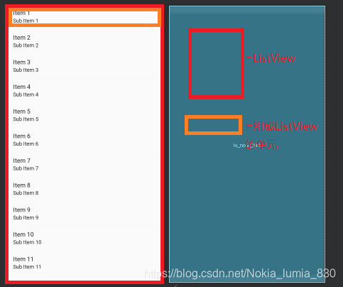 在创建好ListView之后我们还需要为他创建填充项,也就是第一张图中的黄色方框,每个填充其实都是一个Layout布局文件,我们只需要创建好一个,剩下的就交给代码实现。