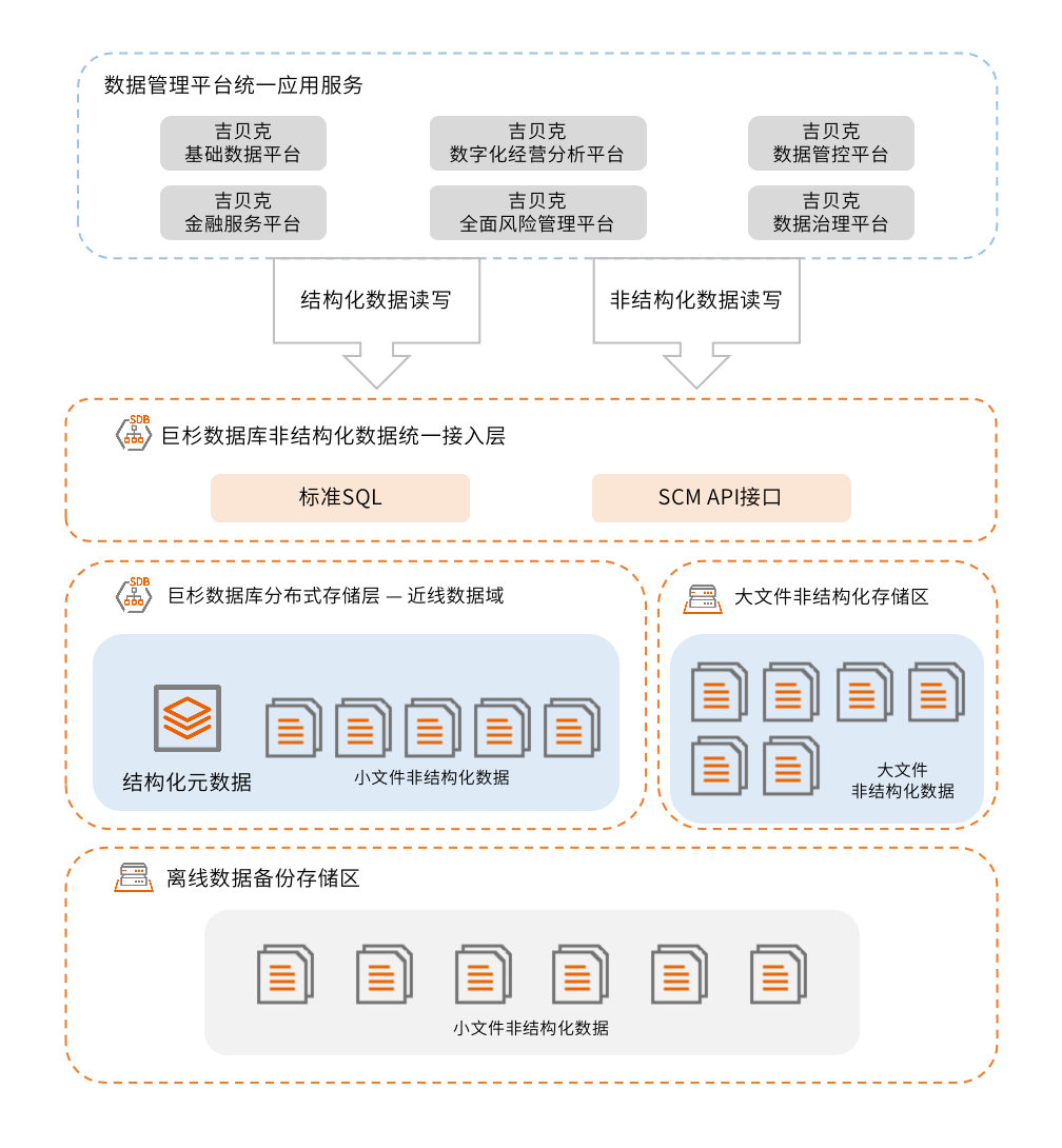金融行业非结构化数据管理平台的底层数据存储采用了SequoiaDB巨杉分布式数据库。SequoiaDB可支撑近线数据,形成结构化数据、半结构化数据和非结构化数据的统一存储。
