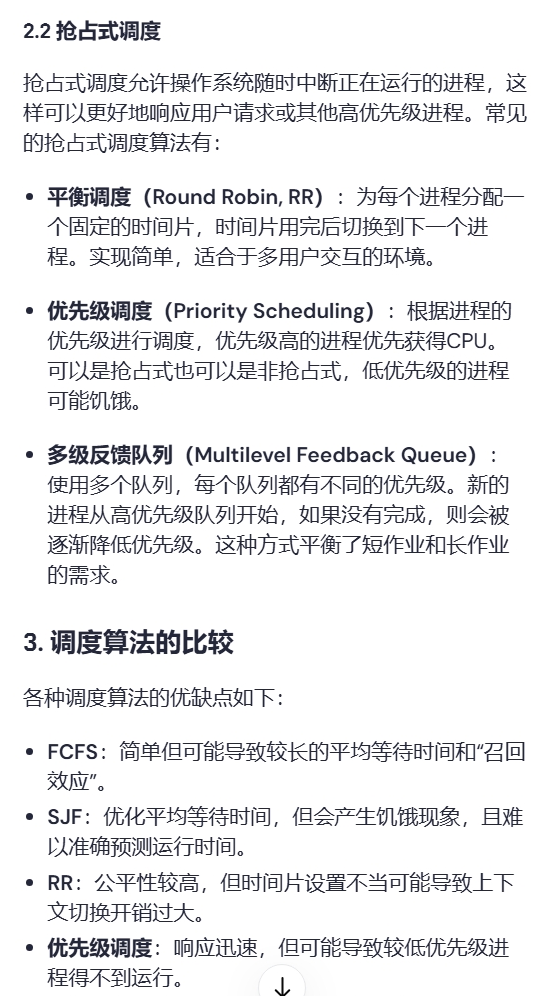 答:轮转调度:采用时间片轮转(Round Robin)调度算法,每个进程在其时间片内运行,时间片到后进行上下文切换。