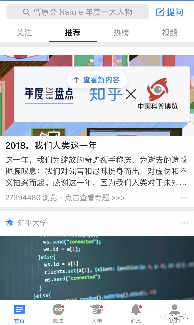 触达:平台可以在“推荐”中非常自然的发表平台想让用户看到的内容(如图中第一条内容(没有特别明显特征):《2018,年度盘点》),而其他tab中平台触达则不是这么自然