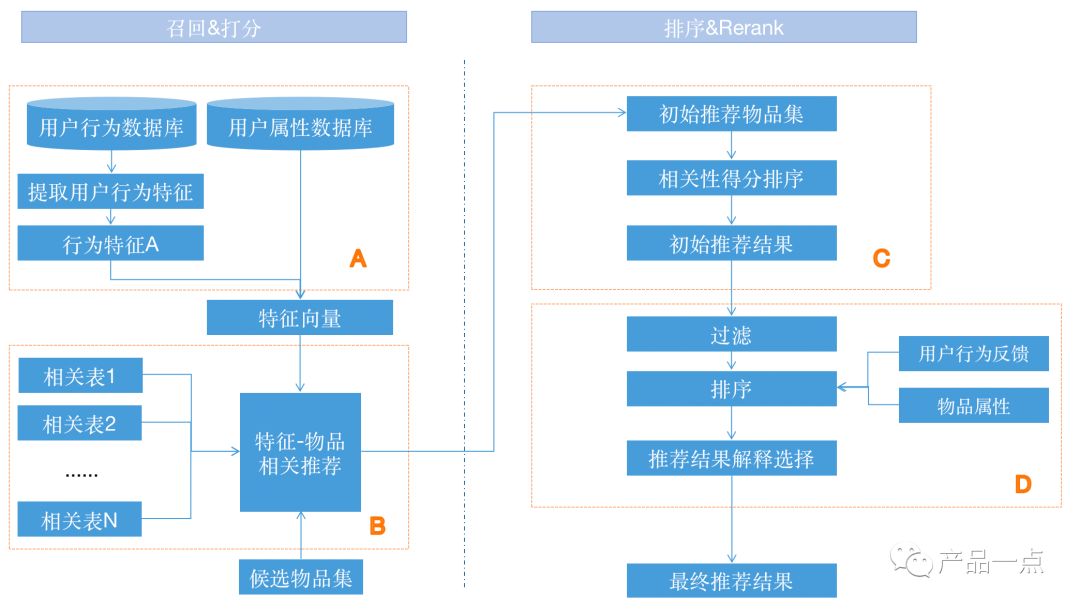 推荐引擎构成主要由四部分构成(书上是三部分,自己扩充了一些),如图所示(左侧为召回&打分,右侧为排序&Rerank):