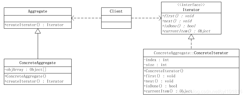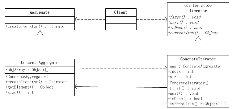 ● 具体聚集(ConcreteAggregate)角色:实现了创建迭代子(Iterator)对象的接口,返回一个合适的具体迭代子实例。