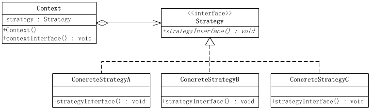 在策略模式中,定义了一些独立的类来封装不同的算法,每一个类封装一种具体的算法,在这里,每一个封装算法的类都可以称之为一种策略(Strategy),为了保证这些策略在使用时具有一致性,一般会提供一个抽象的策略类来做规则的定义,而每种算法则对应于一个具体策略类。