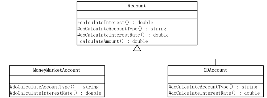 显然,系统需要一个抽象角色给出顶级行为的实现,而将两个作为细节步骤的基本方法留给具体子类实现。由于需要考虑的账号有两种:一是货币市场账号,二是定期存款账号。系统的类结构如下图所示。