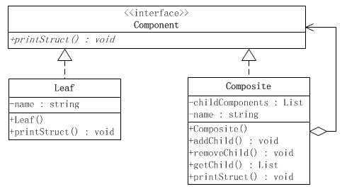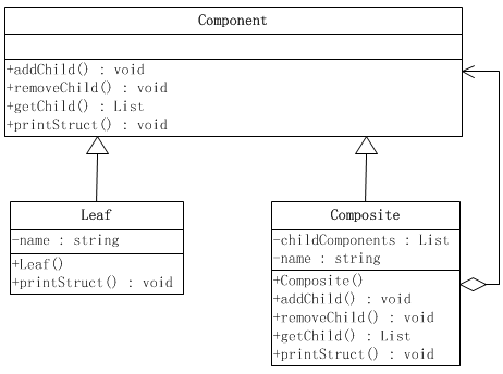 与安全式的合成模式不同的是,透明式的合成模式要求所有的具体构件类,不论树枝构件还是树叶构件,均符合一个固定接口。
