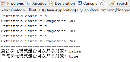 从运行结果可以看出,一个复合享元对象的所有单纯享元对象元素的外蕴状态都是与复合享元对象的外蕴状态相等的。即外运状态都等于Composite Call。