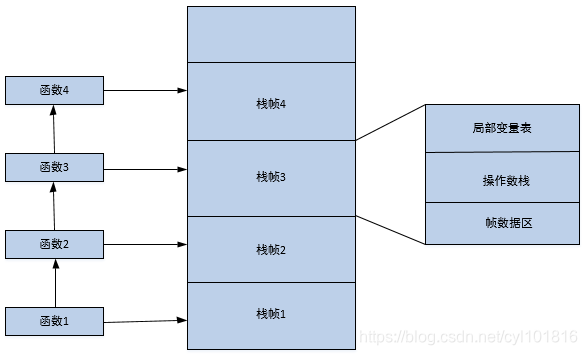 在一个栈帧中,至少包含局部变量表、操作数栈和帧数据区几个部分。