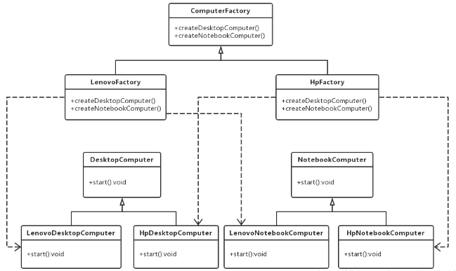 两个抽象产品类分别为DesktopComputer和NotebookComputer ,用来定义两个产品线:台式机和笔记本。它们都定义了start方法,用来启动电脑。