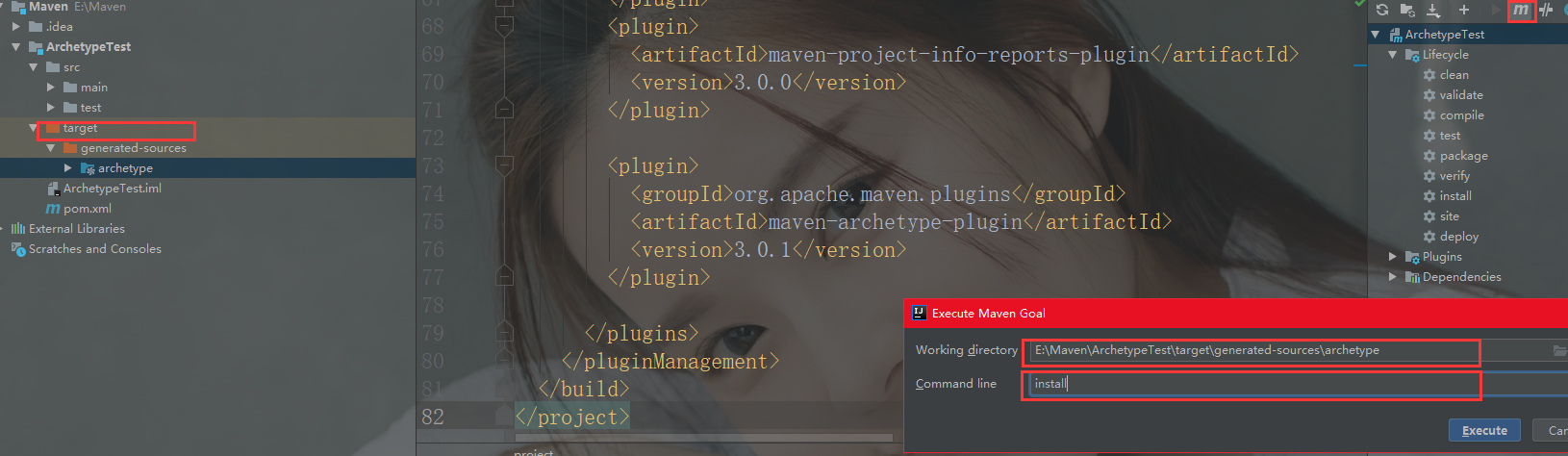 archetype:create-from-project命令执行完之后,项目会生成target目录文件,至此,骨架相当于已经生成,但是需要安装,还需要把骨架添加到maven中。