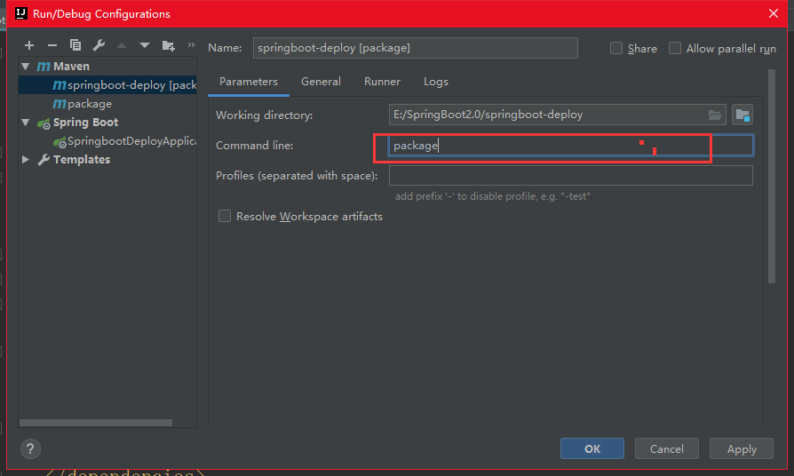 在SpringBoot中默认的打包方式是jar包,因为在SpringBoot中将相关的依赖和配置都集中在里面,所以jar的打包方式是比较简单的。选择Edit Configurations进行打包,选择maven,使用maven命令package打包即可。