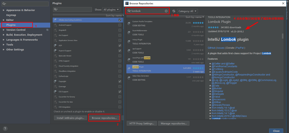 打开idea的设置,点击Plugins,点击Browse repositories,在弹出的窗口中搜索lombok,然后安装即可。
