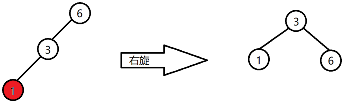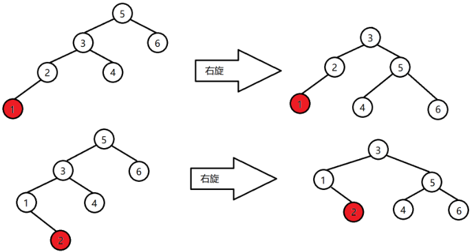 如果插入节点在加入二叉树中的时候,是挂载在了其祖父节点的左孩子下,并且是其父节点的左孩子,并导致整个二叉树的不平衡,那么此时我们使用右旋的方式,对二叉排序树进行调整,即:左左下来右旋