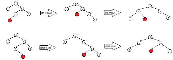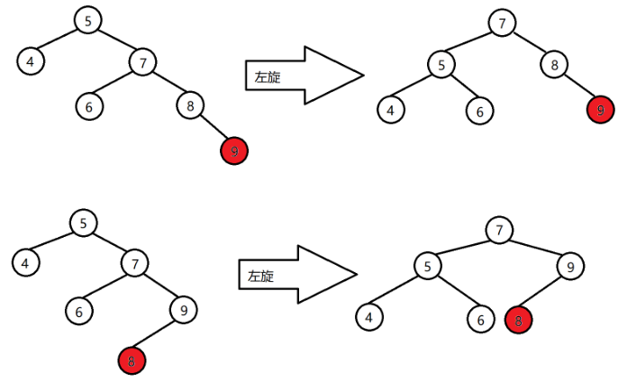 第2个右:曾祖节点右孩子的右子树深度大于等于曾祖节点右孩子左子树的深度,说明问题出在曾祖节点右孩子的右子树上,此时我们通过左旋解决这一问题