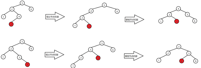 步骤3:祖父节点右旋完毕后,使用新的祖父节点替代曾祖节,曾祖节点及其左孩子成为祖父节点的左孩子,曾祖节点左旋完成