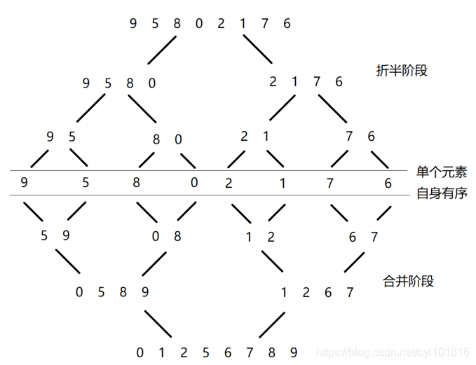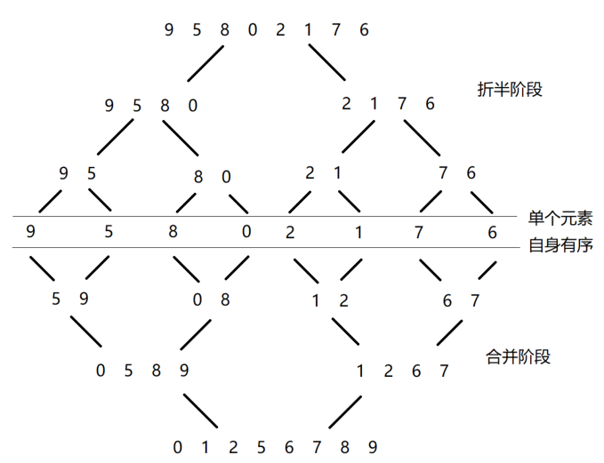 1.在折半阶段中,只要这个序列被拆分的任何一部分的长度依然是大于1的,那么就继续拆分下去