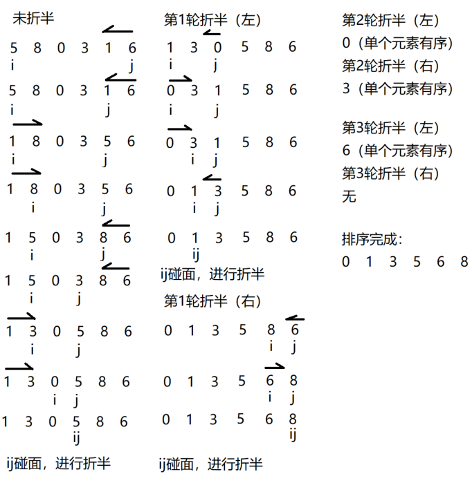 5.在ij碰面之后,对待排序序列进行折半,对折半后两侧的元素进行排序的操作,实际上和对整个序列进行的排序操作方式是相同的。直到折半之后,左右只剩下一个元素,或者没有剩下任何元素为止。也就是说,这个折半和排序的流程,可以使用递归实现