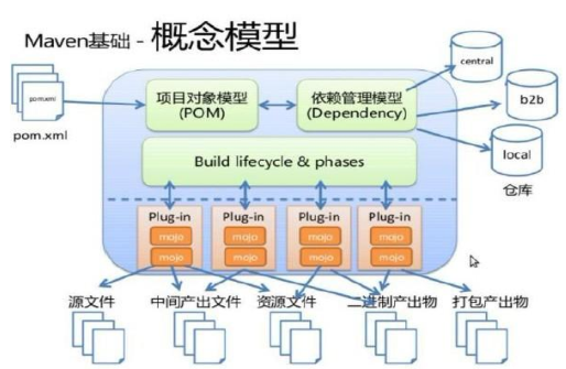 Maven 包含了一个项目对象模型 (Project Object Model),一组标准集合,一个项目生命周期(ProjectLifecycle),一个依赖管理系统(Dependency Management System),和用来运行定义在生命周期阶段(phase)中插件(plugin)目标(goal)的逻辑。