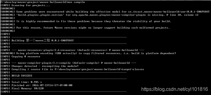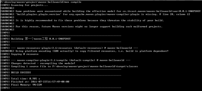 compile 是 maven 工程的编译命令,作用是将 src/main/java 下的文件编译为 class 文件输出到 target目录下。cmd 进入命令状态,执行mvn compile,如下图提示成功: