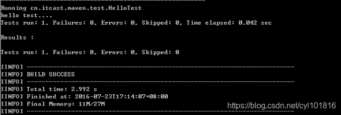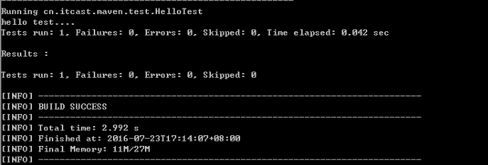test 是 maven 工程的测试命令 mvn test,会执行src/test/java下的单元测试类。cmd 执行 mvn test 执行 src/test/java 下单元测试类,下图为测试结果,运行 1 个测试用例,全部成功。