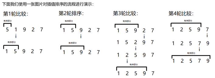 在学习插值排序之前,首先让我们回忆一下我们曾经玩过的扑克牌游戏的抓牌的过程:假设现在我的手里有4张牌,分别是♥A,♦3,♥8和❀9,并且我从牌堆中又抽取了一张牌,这张牌是♠7,那么,我们应该如何确定这张♠7应该放在我手牌中的什么位置,才能够保证手牌是有序(仅比较大小,忽略牌的花色)的呢?实际上很简单,首先我们发现:我的手牌现在本身就是有序的,然后我们可以将这张♠7首先和❀9进行比较,我们发现,♠7小于❀9,那么我们将这张♠7放在❀9的前面,与它前面的一张牌继续比较❀9的前面是♥8,♠7又小于♥8,所以我们将♠7放在♥8的前面,继续和前一张牌进行比较♥8的前面是♦3,♠7不小于♦3,那么此时♠7就找到了自己在手牌中的位置,不需要继续向前移动并进行比较了上面这一系列抓牌的流程,实际上就是一个完整的插值排序的流程,所以我们可以将插值排序的流程总结成为:将待排序序列(牌堆)中的第一个元素(抓到的牌)与前面有序序列(手牌)中的元素逐一比较,反序则互换并继续向前比较,否则停止比较,元素归位。实际上,插值排序的思想得益于“前面的n个元素都是有序”的这一思想,也就是说:新元素之所以下不小于某一个元素,之后就可以停止比较和互换,是因为如果他不小于第m个元素,那么在有序序列中他也一定不小于前m-1个元素。