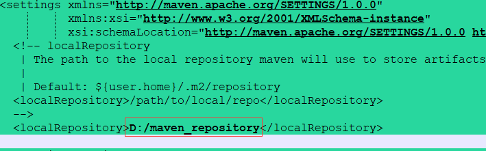 打开settings.xml文件,查找到<localRepository>标签,修改内容即可,这里是创建为D盘下的路径,可以根据自己的情况修改。