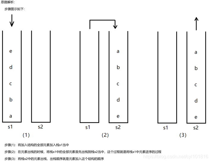//[1]如果元素要从结构中退出,那么将栈s1中所有的元素全部出栈,并按照元素出栈顺序加入到栈s2中