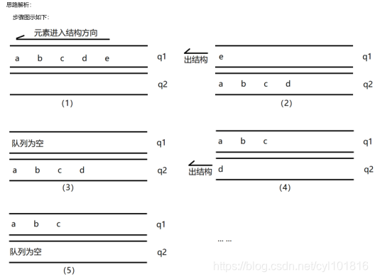 步骤(2):当元素e要退出结构的时候,将q1中除了元素e之外的其他元素全部出队列q1,并同时加入队列q2