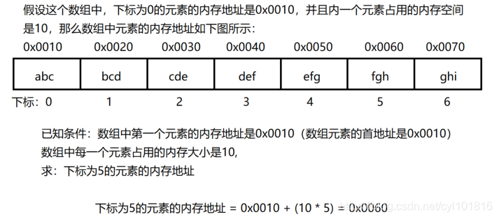 数组中下标为0的元素的内存地址就是这个数组在内存中的起始地址,也称之为数组的首元素地址,由此可见,通过公式计算元素的内存地址,比逐个遍历数组元素进行查找要快的多