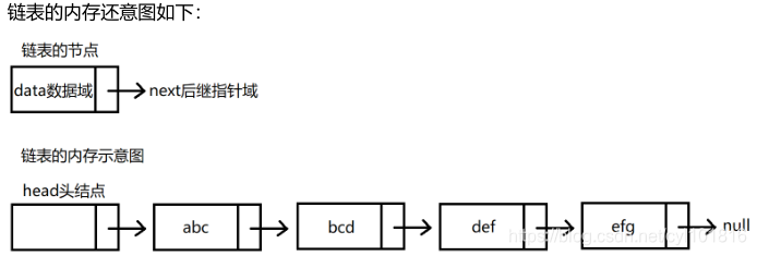 - 链表的节点一般分为两个部分:data数据域,用来存储要保存的数据,例如一个字符串、一个User对象等等;next后继指针域,用来保存下一个节点的内存地址,串起整个链表结构;