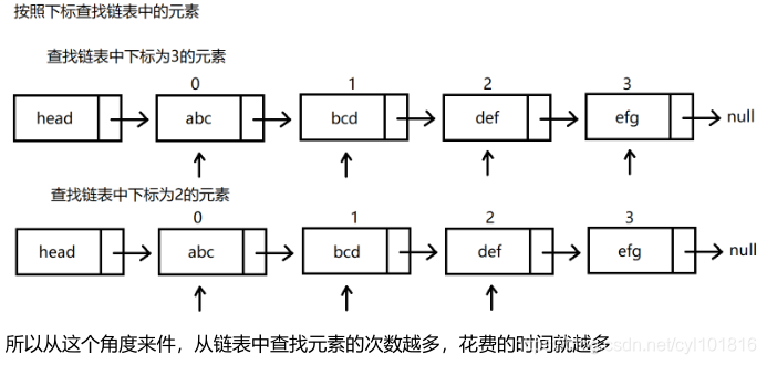 当一个链表需要存储一个新的元素的时候,都要重新new一个节点对象出来,而重新new出来的节点对象的内存地址和其他节点的内存地址之间是没有任何关系的。所以从这一点看来,如果我们想要按照下标对链表中的元素进行访问,类似于数组中的快速随机访问的公式就是不可用的了。所以我们在按照下标访问链表元素的时候,就不得不每一次都从链表的头结点开始,每向后遍历一个节点就记一次数,直到到达目标下标的节点为止。