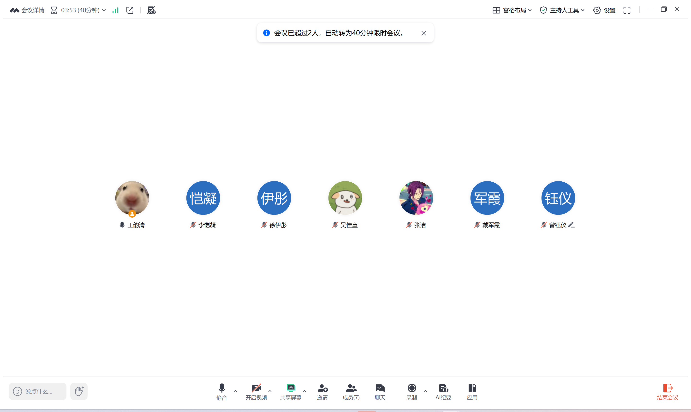 因为各成员有不同的课程与实习安排,难以找到大家都在的线下时间,所以采用线上会议代替站立式会议。