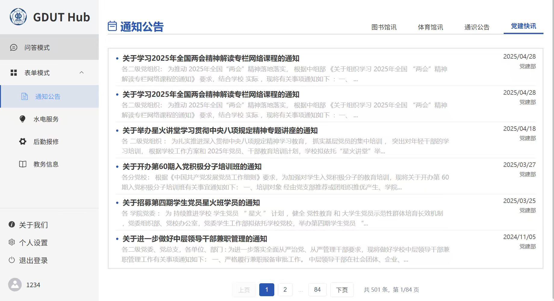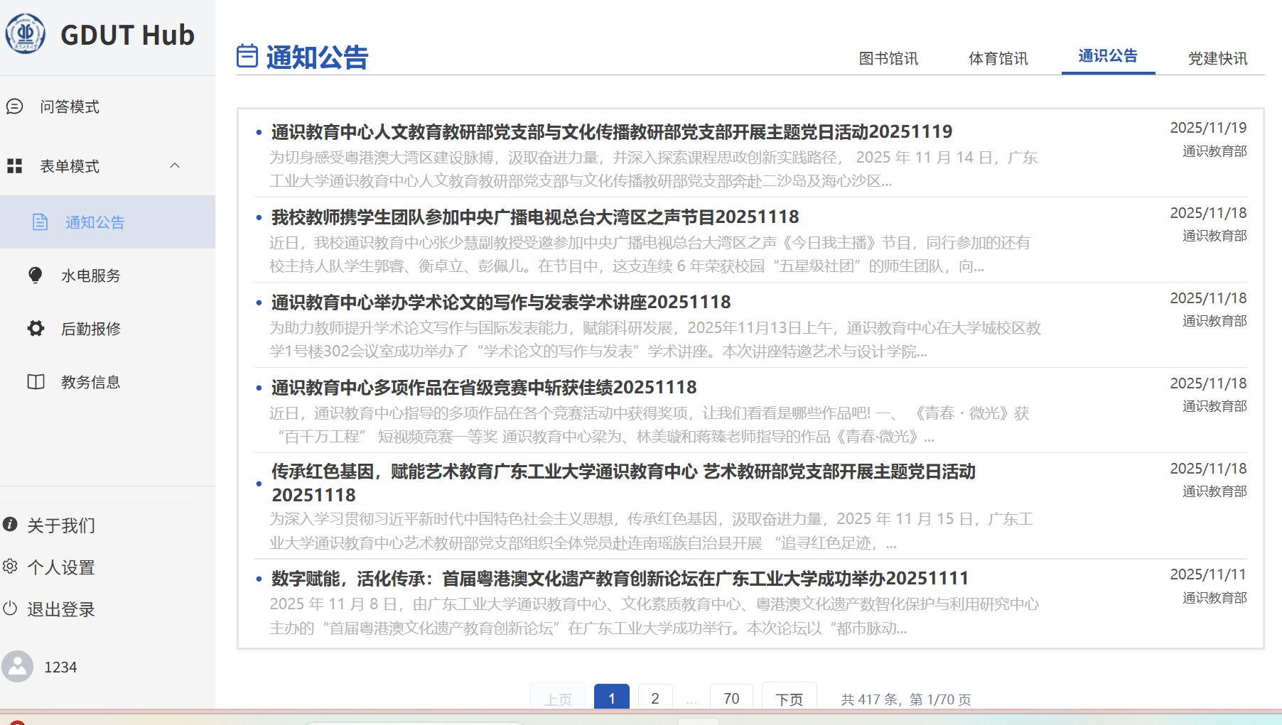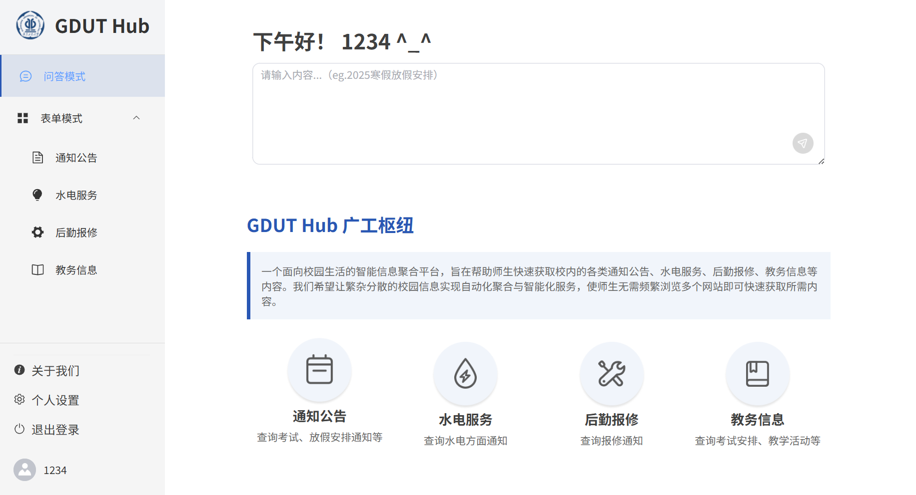 广工枢纽(GDUT Hub)是广东工业大学校园智能信息聚合平台,支持师生获取通知公告、水电服务、后勤报修、教务信息等校内内容,实现校园信息的聚合与智能化服务。