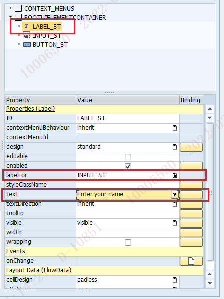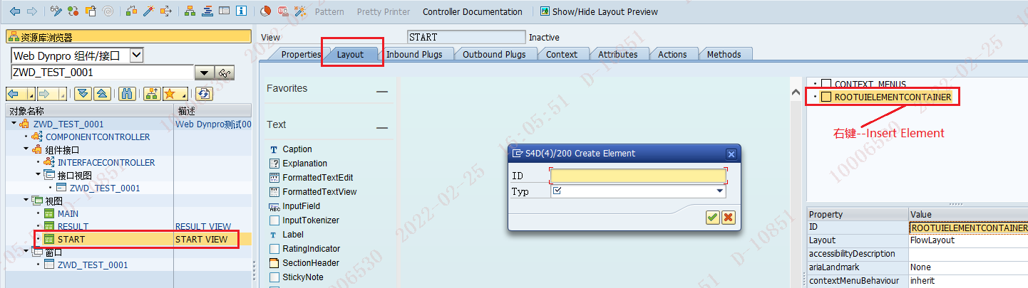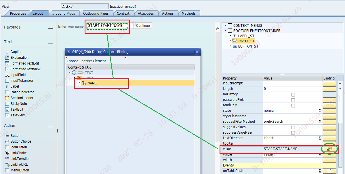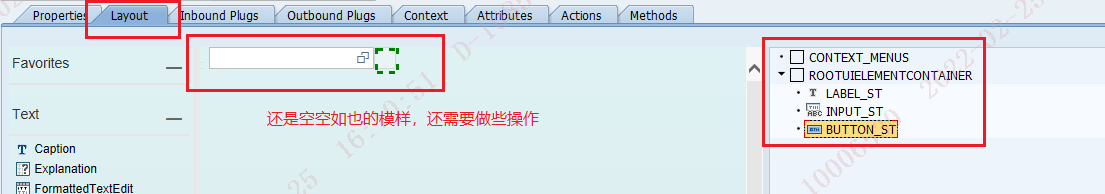 5.在 START 视图的 layout 页签,ROOTUIELEMENTCONTAINER中添加 label , input和button: