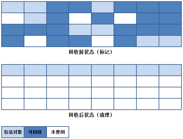 “标记-清除”(Mark-Sweep)算法是最早出现也是最基础的垃圾收集算法,“标记-清除” 算法分为 “标记” 和 “清除” 两个阶段:首先标记出所有需要回收的对象,在标记完成后,统一回收掉所有被标记的对象。也可以反过来,标记出所有存活的对象,在标记完成后,统一回收掉所有未被标记的对象。