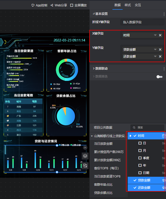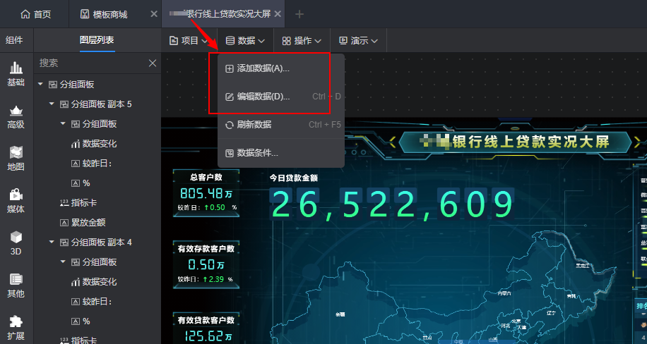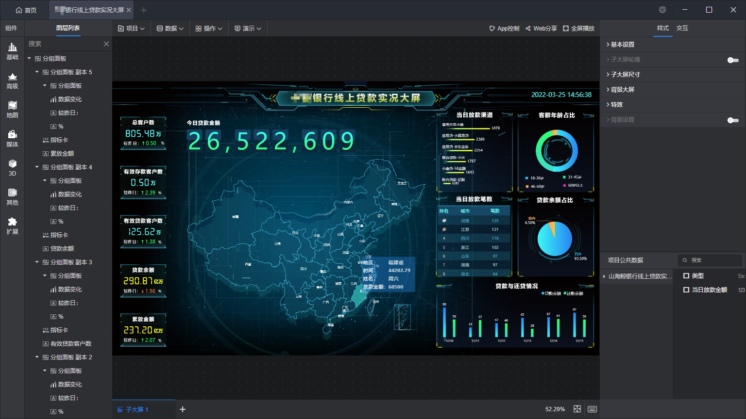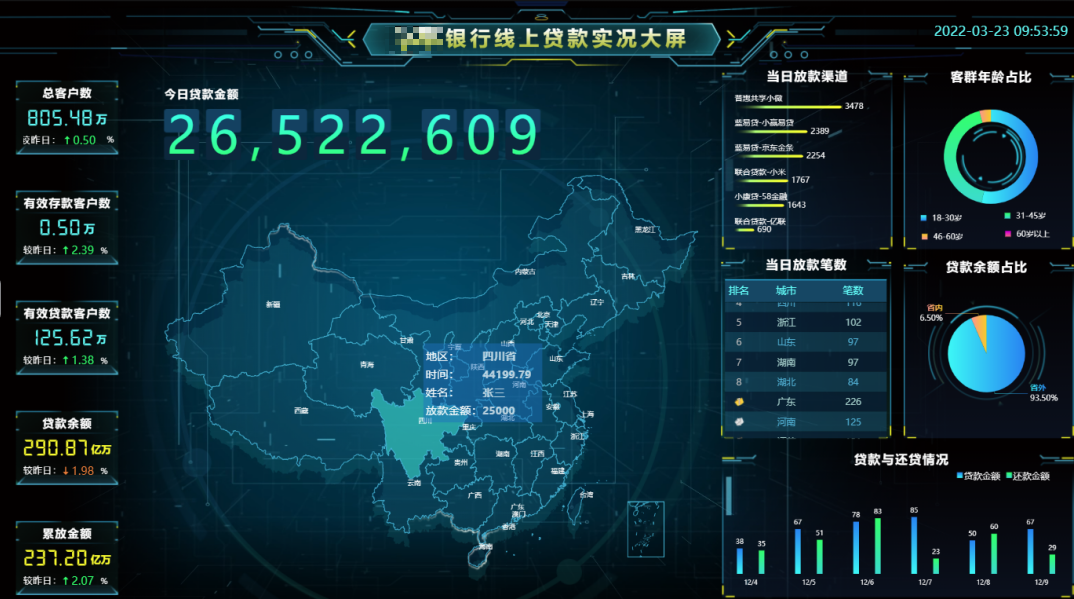 在完成以上步骤之后,这个银行线上贷款实况大屏的内容就制作完成了。