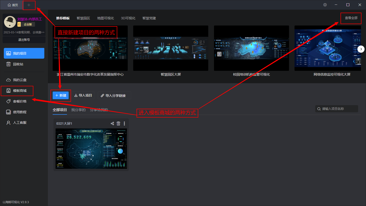 首先,在山海鲸可视化软件首页有以下两种方式完成新建大屏任务: