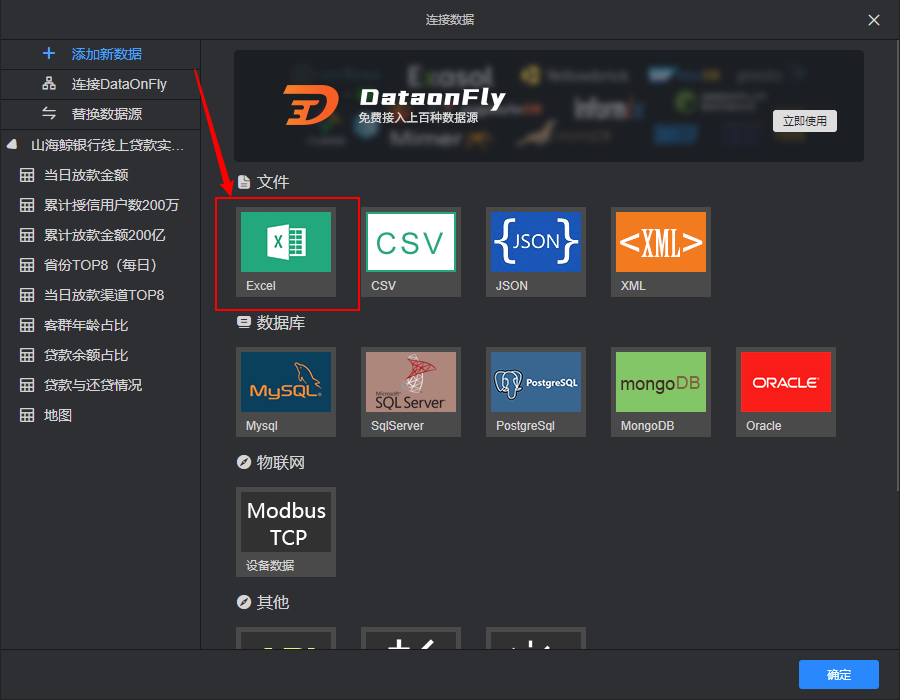 山海鲸可视化支持接入Excel、CSV、HML等文件、MySQL、SqlServer、MongoDB等数据库、modbus TCP物联网等多种数据源,在此我们以Excel为例进行演示: