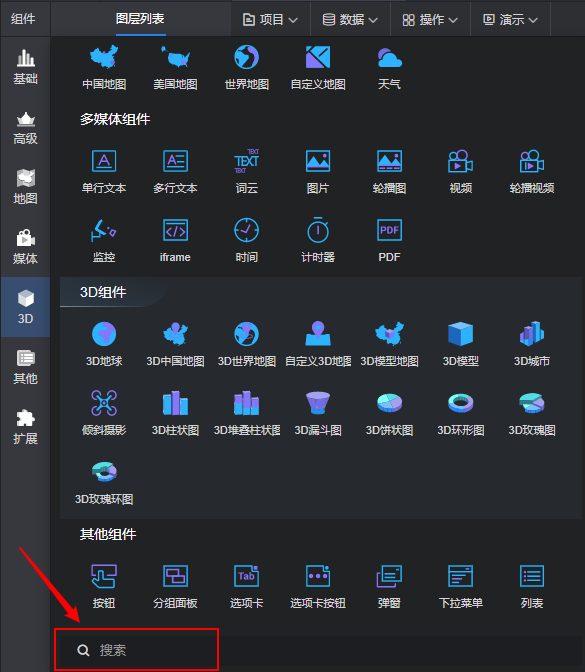 山海鲸可视化提供丰富的组件,我们可以根据需要数据呈现的要求来进行组件的选择,也可以直接在搜索框中对组件进行搜索。