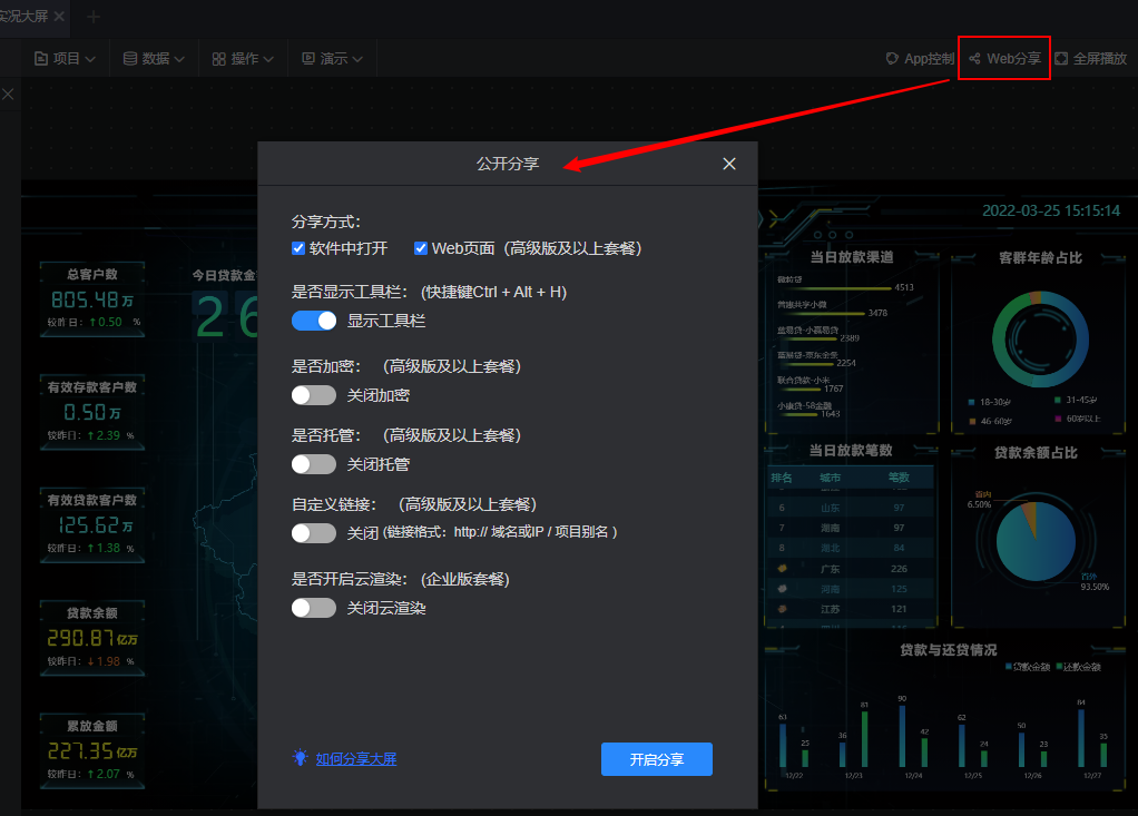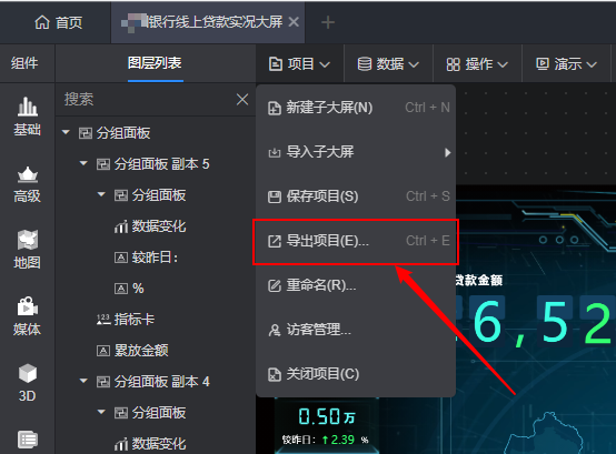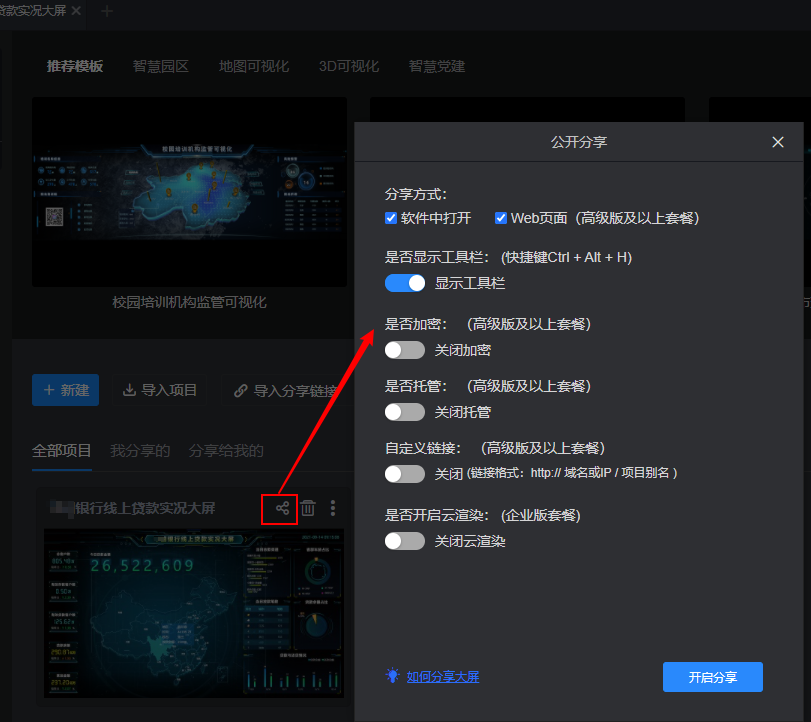 如果需要分享大屏的话可以在大屏编辑界面分享大屏,也可以在软件首页选中“项目”分享大屏。