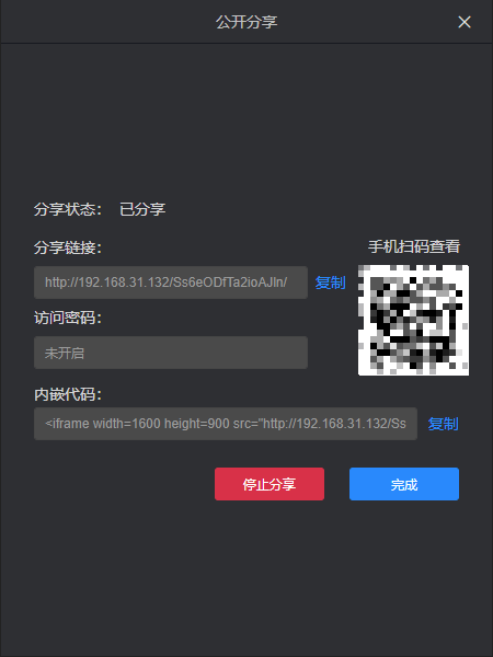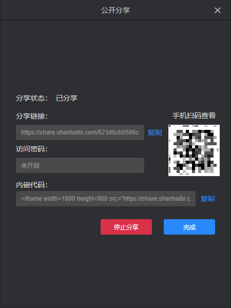 分享完成之后会自动生成分享链接和内嵌代码,点击“复制”可以复制内容。