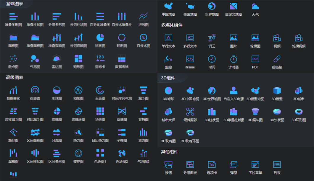 图表组件丰富,支持3D模型搭载数据,支持自定义扩展组件