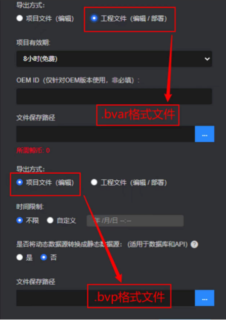 (1)导出:保存后的大屏可以导出到本地,根据自己的不同需要可以导出为本地可编辑项目文件和服务器部署工程文件两种文件类型。