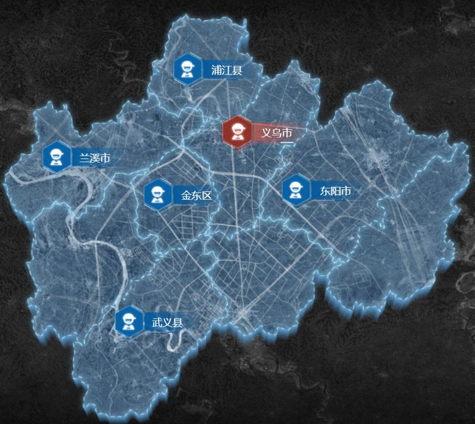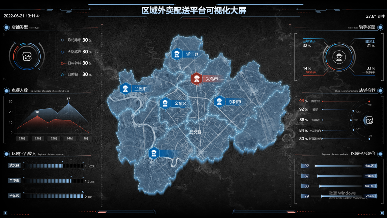 本大屏所展示的是浙江省金华市的部分区域,它是平面地图与外卖数据的结合,即通过可视化组件展示外卖数据,使其具有视觉冲击力。