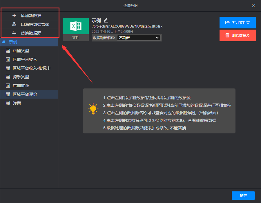 新建空白大屏可选择“添加新数据”,载入模板大屏可选择“替换数据源”,而以上两种新建大屏的方式均可以连接山海鲸数据管家进行数据接入。