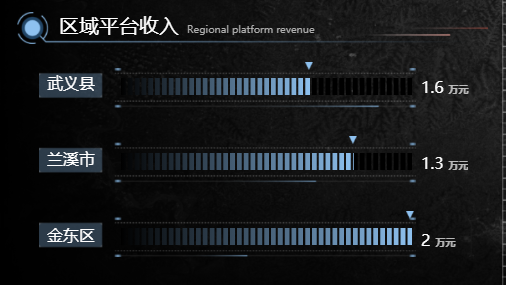 本大屏是对“武义县”、“兰溪市”以及“金东区”三个地方的区域平台收入的对比,以条形图的形式展现。