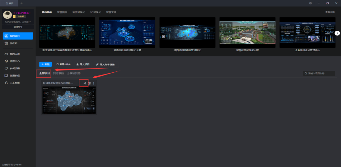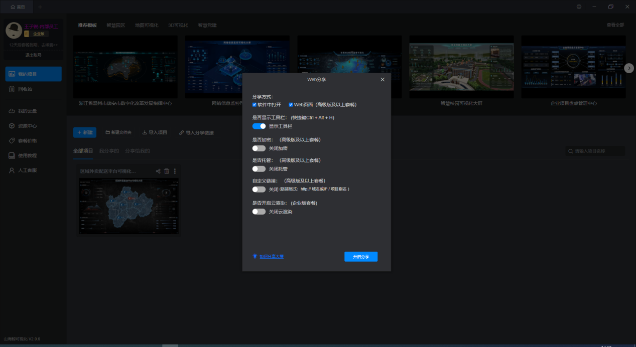 (2)分享:若有分享大屏的需求,可以在“我的项目”页面中的“全部项目”界面,点击项目卡片上的“公开分享”按钮可以打开公开分享设置窗口。