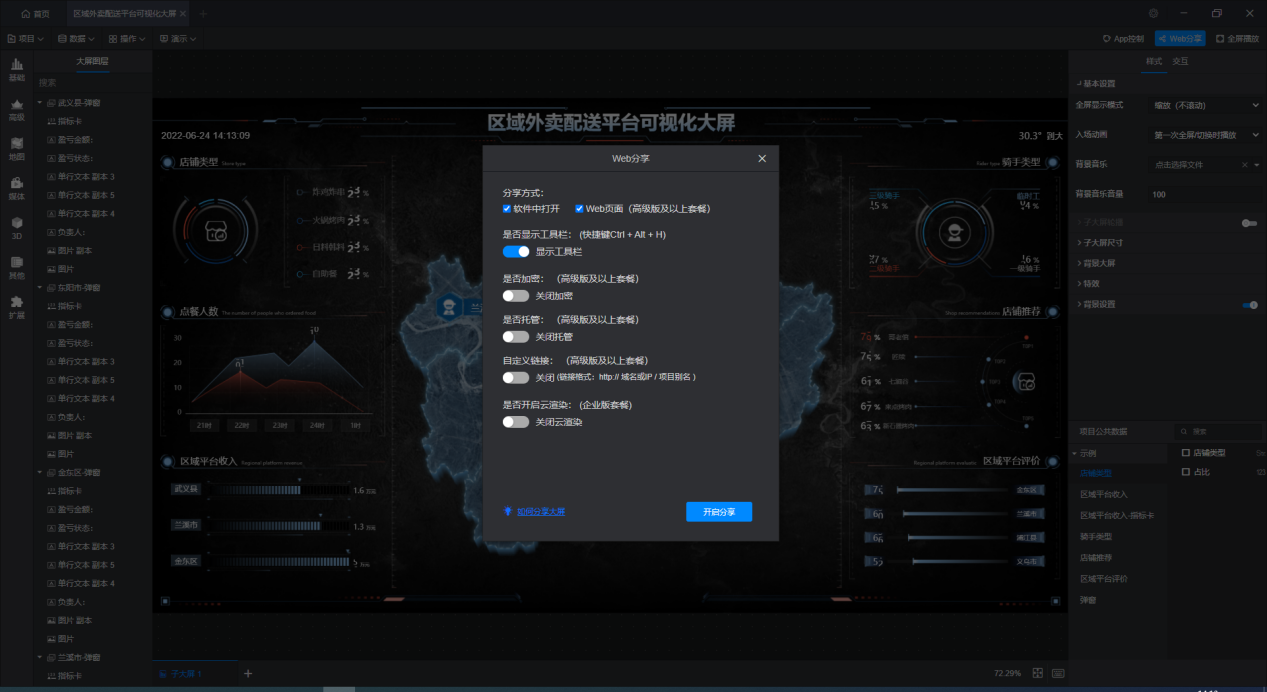 其次第二种方法就是在大屏编辑界面中点击工具栏右侧的“web 分享”按钮可以打开公开分享的设置窗口。