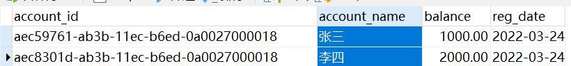 INSERT INTO account(account_id,account_name,balance,reg_date) VALUES(UUID(),'张三',1000,CURDATE()); INSERT INTO account(account_id,account_name,balance,reg_date) VALUES(UUID(),'李四',2000,CURDATE());
